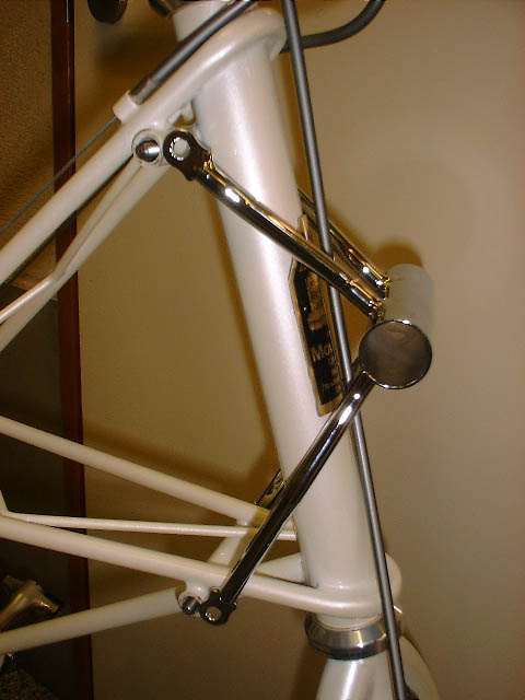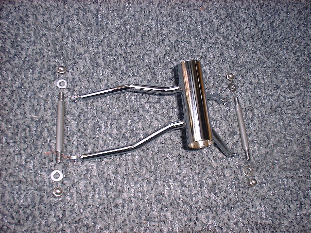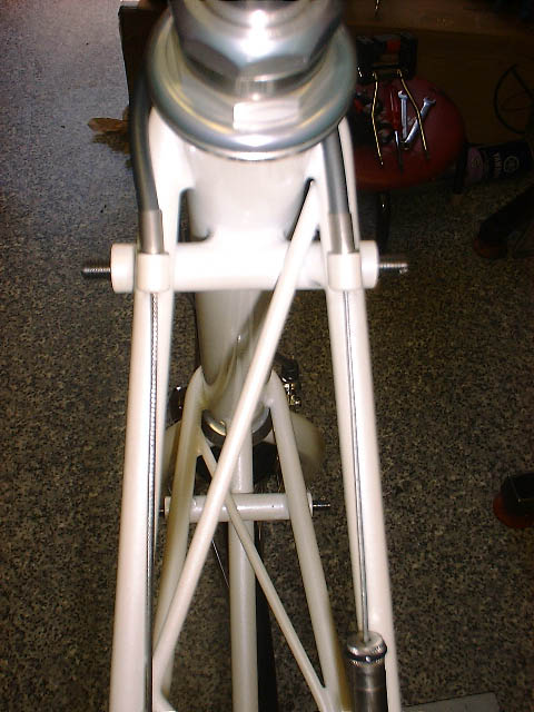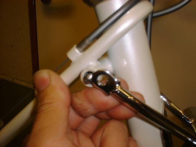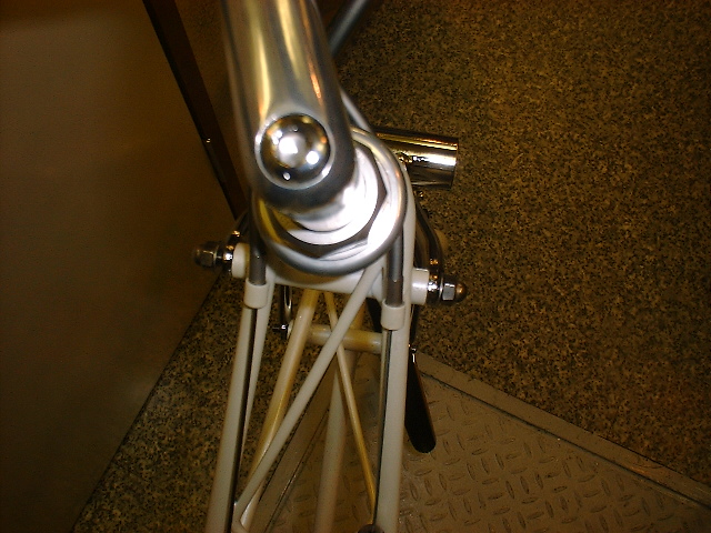 | 最初に2本の段付きボルトをフレームのパイプに差込みます。 この時、鉄のボルトの為、油は拭取らず差込んで下さい。 |